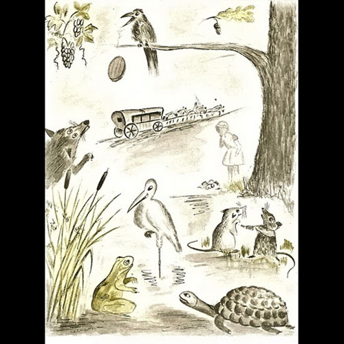| Just so Stories by Rudyard Kipling. 2013 showing a leopard pouncing on a hedgehog and a Tortoise. |