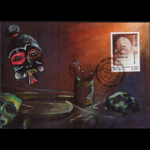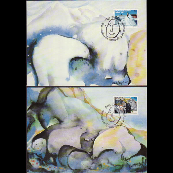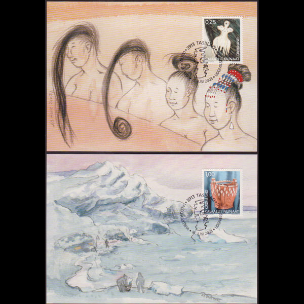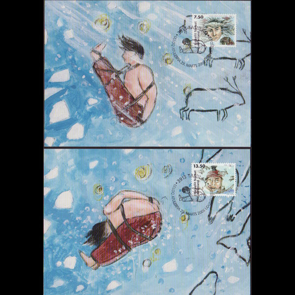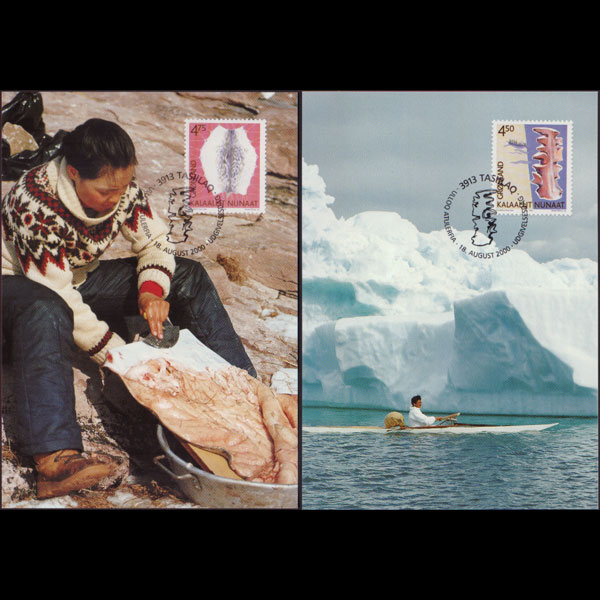 | 说明:贴文化遗产-木制地图和海豹皮2全。首日纪念戳。共2枚。 |