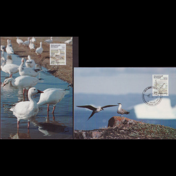 | 说明:贴极地鸟类-雪雁和贼鸥(1990年组)。首日纪念戳。共2枚。 |