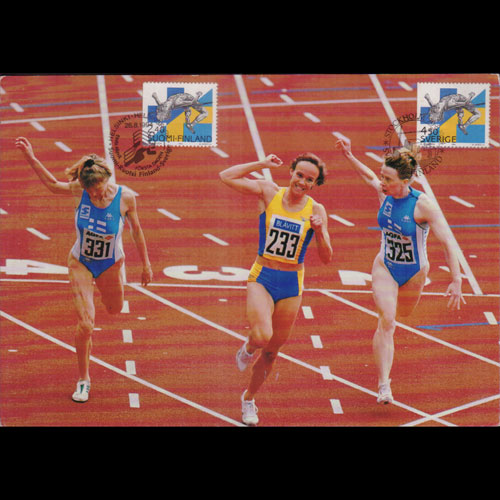 | 说明:贴和瑞典联合发行-芬瑞田径赛跳高运动员舍贝里(2.4m)和瑞典跳高同图票1枚。首日纪念戳。 |