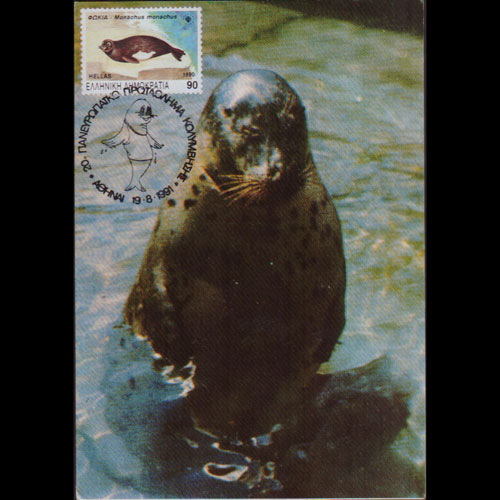 | 说明:贴濒危动物-僧海豹(90d)。纪念戳19.8.1991。 |