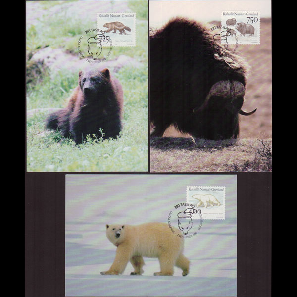 | 说明:贴本岛动物-北极熊和貂熊等3全。首日纪念戳。共3枚。 |