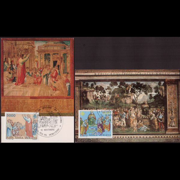 | 说明:贴拉斐尔教堂穹顶画(50-400l)。拉斐尔头像首日纪念戳。共2枚。 |