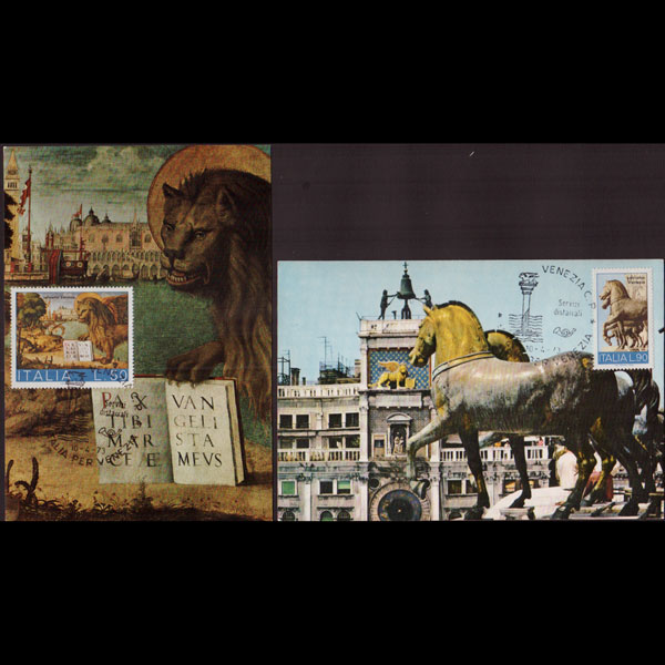 | 说明:贴拯救威尼斯-绘画和铜马(50-90l)。首日纪念戳。共2枚。 |