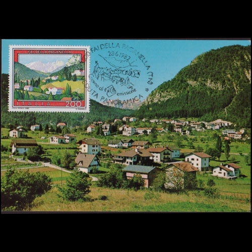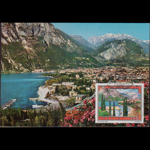 | 说明:贴风景系列画-加尔达湖(150l)。首日纪念戳。明信片图案加尔达湖风光。 |