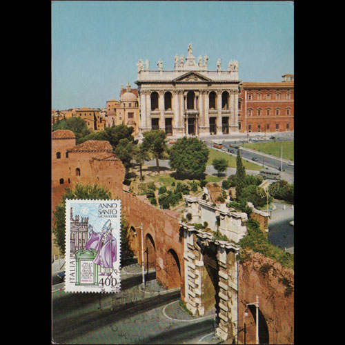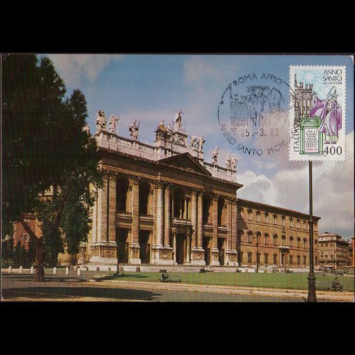 | 说明:贴教堂和教皇-圣年(400l)。教皇和教堂图首日纪念戳。明信片图案罗马拉特朗大教堂。 |