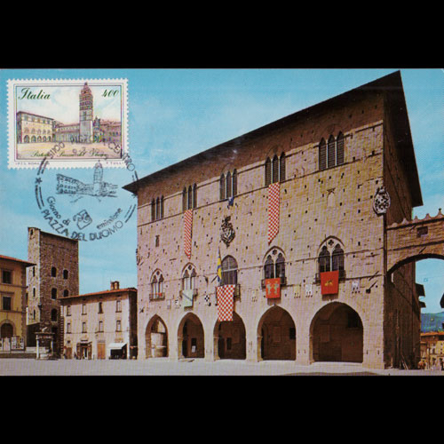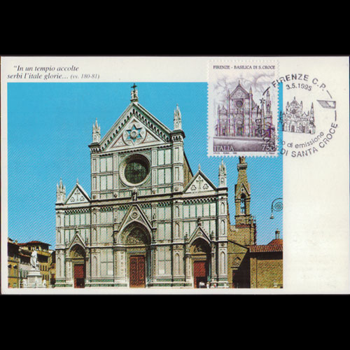 | 说明:贴佛罗伦萨圣十字教堂1全。首日纪念戳。票戳和明信片图案均为圣十字教堂。 |