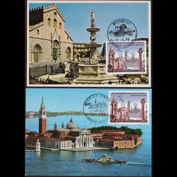 | 说明:贴欧共体会议-威尼斯和墨西拿建筑1全。首日纪念戳。明信片图案分别是墨西拿和威尼斯风光。共2枚。 |
