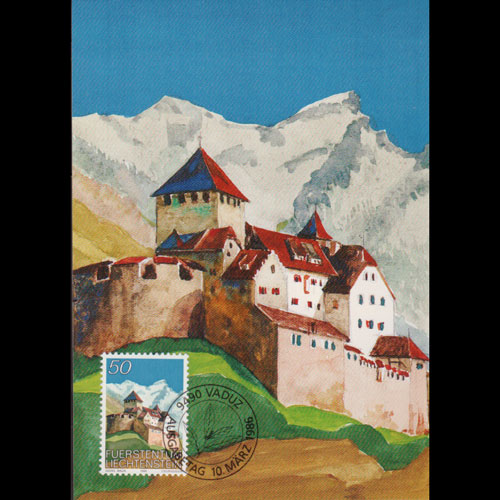 | 说明:贴瓦杜兹城堡风光(50r)。首日纪念戳。 |