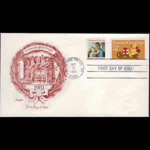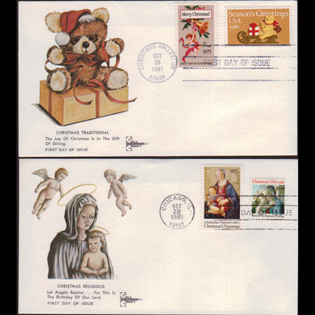 | 说明:贴1981年和1975年圣诞节4全。销CHRISTMASVALLEY(圣诞谷)和芝加哥首日戳。由GillCraft设计。共2枚。 |