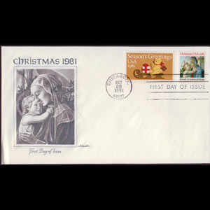 | 说明:贴圣诞节-波提切利绘画等2全。销CHRISTMASVALLEY(圣诞谷)和芝加哥首日戳。ArtCraft设计。共2枚。 |