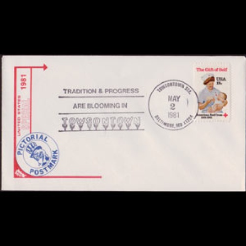 | 说明:贴1981年美国红十字会百年-护士1全。陶森镇传统和进步齐发展宣传戳。 |