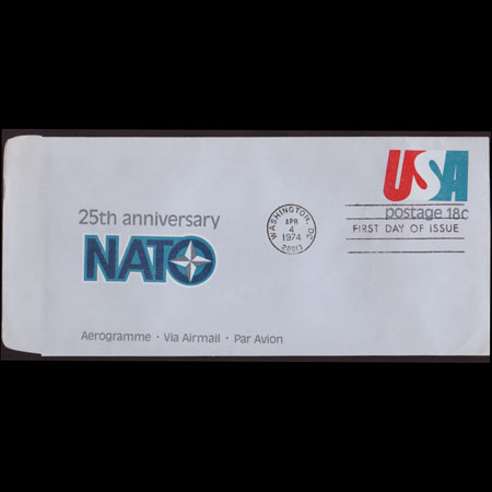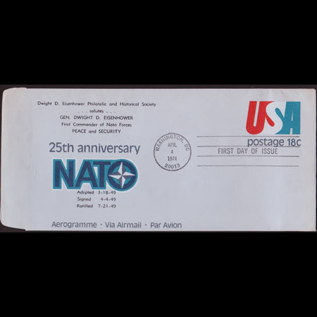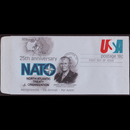 | 说明:斯科特编号UC49。北约25年。WASHINGTON首日戳。北约首任司令艾森豪威尔附加字。 |