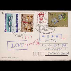 | 说明:花卉(5zt)。加贴蜻蜓和飞机票各1枚。寄上海。背面落地戳。 |
