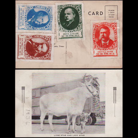 | 说明:牛和火车厢图。正面贴四枚美国历届总统票(非官方邮品)。局部皱。 |