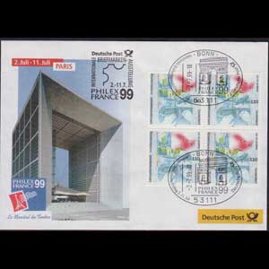 | 说明:法国邮展。贴1999年汉诺威世博会4枚。巴黎凯旋门图纪念戳。 |