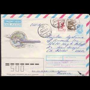 | 说明:贴普票数枚-鹤和骑马等。销莫斯科圆戳。寄美国。 |