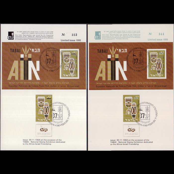 | 说明:1964年发行MS以非友谊-手鼓复制图。邮电部特许为海法全国邮展发行。共2枚。 |