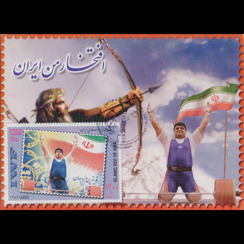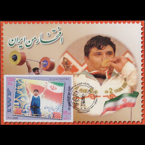 | 说明:贴本国奥运举重冠军礼萨扎德1全。首日纪念戳。 |