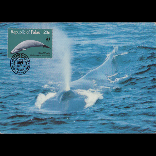 | 说明:贴WWF-蓝鲸(20c)。首日纪念戳。 |