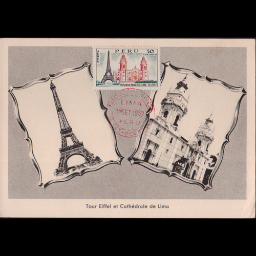 | 说明:贴法国博览会-埃菲尔铁塔和利马大教堂(50c)。首日纪念戳。 |