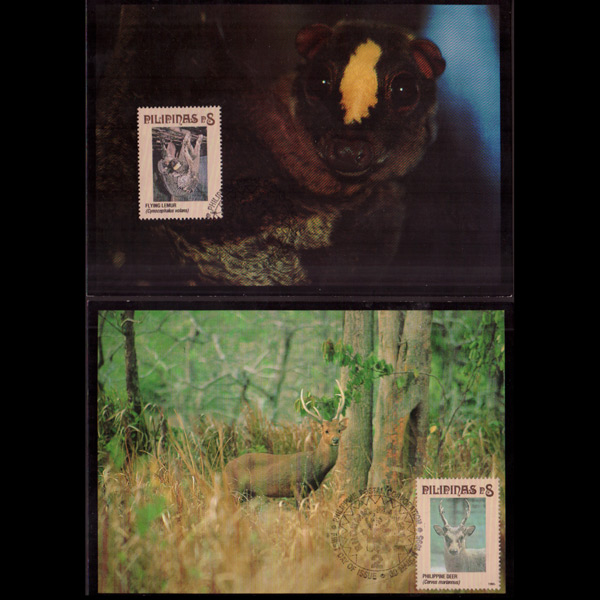 | 说明:贴野生动物-鼯猴和菲律宾鹿2全。首日纪念戳。共2枚。 |