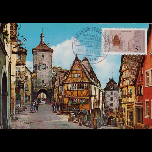 | 说明:贴同年发行欧洲建筑遗产年-罗腾堡建筑风光(50p)。纪念戳1-9.75。 |