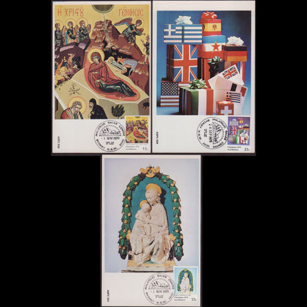 | 说明:贴圣诞节-国旗图和雕像等3全。首日纪念戳。共3枚。 |