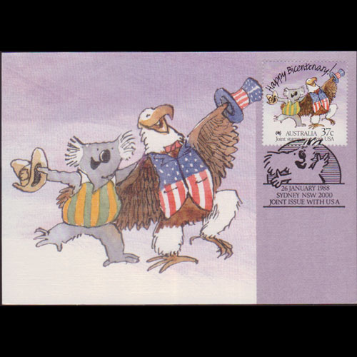 | 说明:贴澳洲200年-考拉和白头雕1全。首日纪念戳。 |