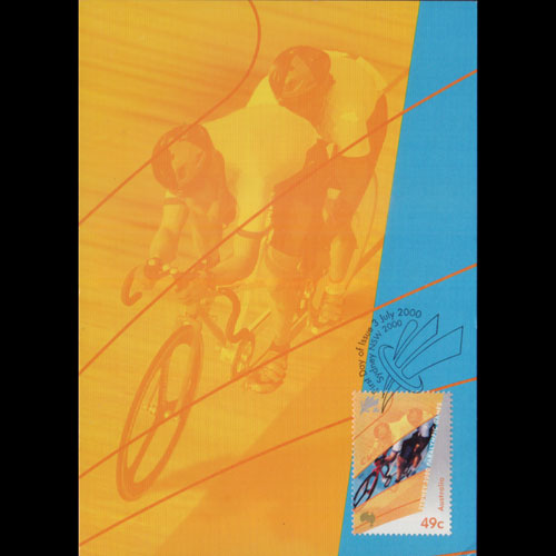| 说明:贴悉尼特殊奥运会-视障运动员自行车赛(49c)。首日纪念戳。 |