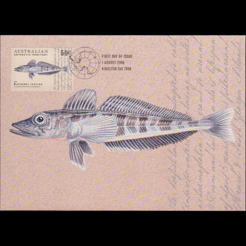 | 说明:贴南极鱼类-冰鱼(50c)。首日纪念戳。 |