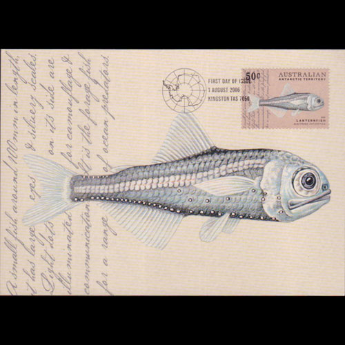 | 说明:贴南极鱼类-灯笼鱼(50c)。首日纪念戳。 |