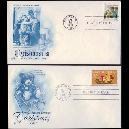 | 说明:贴圣诞节-波提切利绘画等2全。销CHRISTMASVALLEY(圣诞谷)和芝加哥首日戳。ArtCraft设计。共2枚。 |