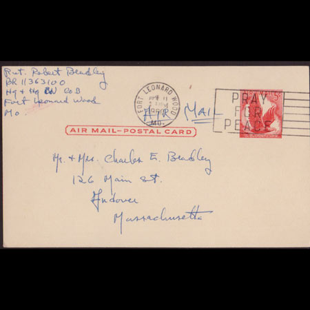 | 说明:国鸟白头雕(5c)。销FORT LEONARDO/PRAY FORPEACE宣传戳(为和平祈祷)。 |