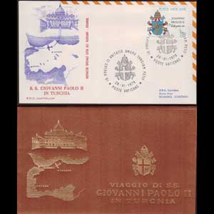 | 说明:教皇保罗二世出访土耳其。贴1979年新教皇保罗加冕1枚(170l)。教皇徽图纪念戳。金箔外套。 |