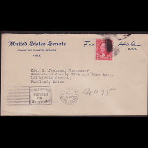 | 说明:贴1932年华盛顿总统2c。参议院海军事务委员会封。销WASHINGTONDC挂号/投险贵重邮件宣传戳。上方开口。右上角破损。 |
