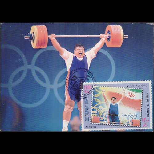| 说明:贴本国奥运举重冠军礼萨扎德1全。首日纪念戳。 |