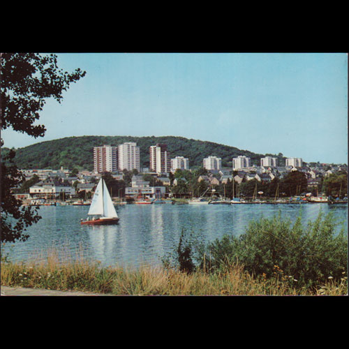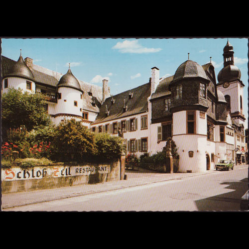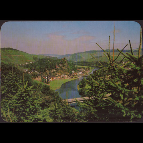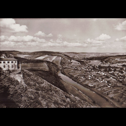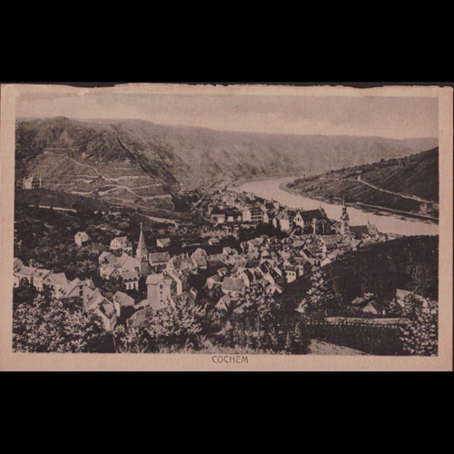 | 说明:科赫姆镇和摩泽尔河风光。俯瞰图。上方边沿粘连撕损。 |