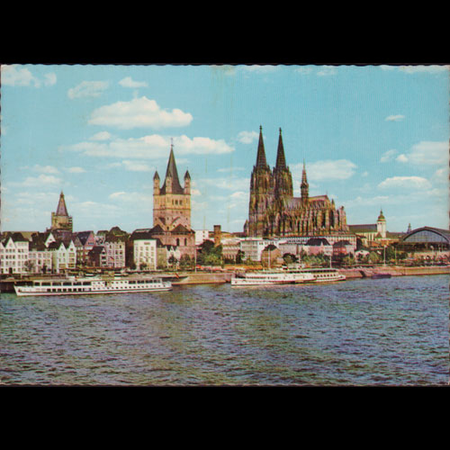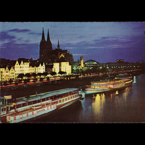 | 说明:科隆大教堂和莱茵河蒸汽轮。背黄。 |