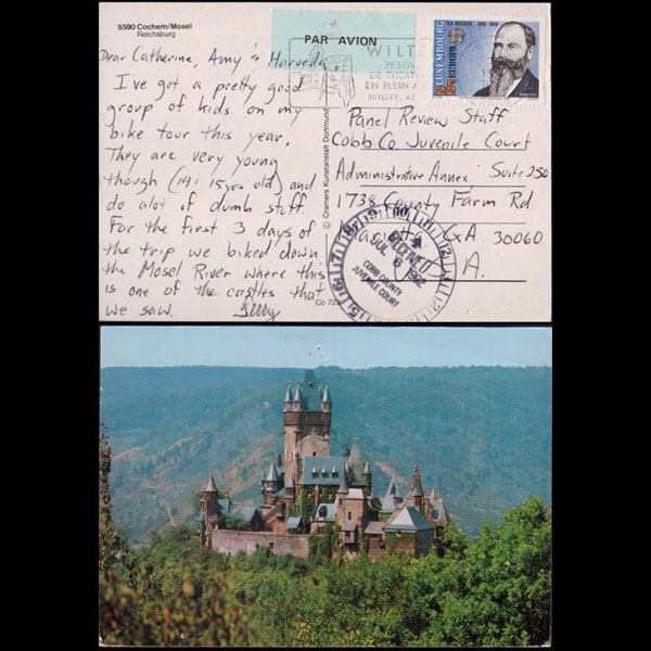 | 说明:贴同年发行欧罗巴-诗人记者贝克尔(22f)。销WILTZ纪念戳日期不清。美国到达戳。背面科赫姆城堡图。 |