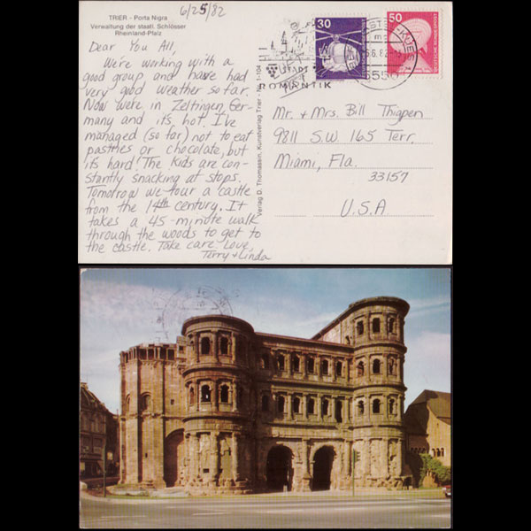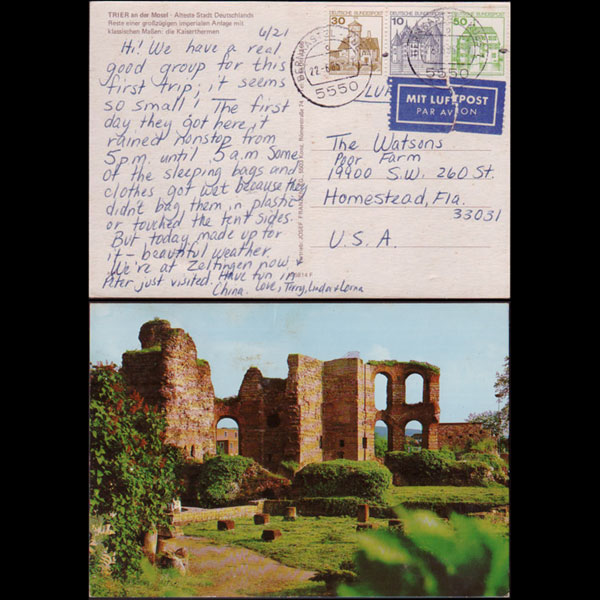 | 说明:贴城堡普票3枚(10-50p)。日戳BERNKASTEL 22-685。寄美国。背面古罗马凯撒浴池遗迹。 |