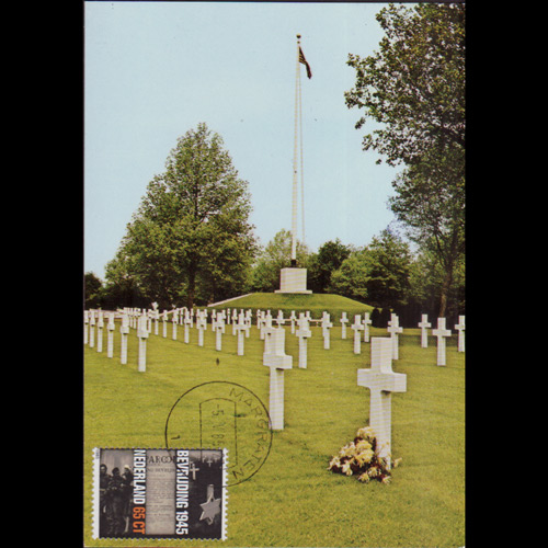 说明:贴二战首都解放-报纸和美军墓地(65c)。首日戳。